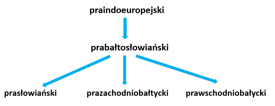 - nowsza hipoteza zakłada, że różnice między językami wschodniobałtyckimi (litewski, łotewski) a językami wschodniobałtyckimi (wymarły staropruski) są zbyt silne, by zakładać istnienie wspólnego etapu prabałtyckiego. Według tej hipotezy język prabałtosłowiański podzielił się od razu na gałąź słowiańską, gałąź zachodniobałtycką i gałąź wschodniobałtycką (i nie było czegoś takiego jak “język prabałtycki”).